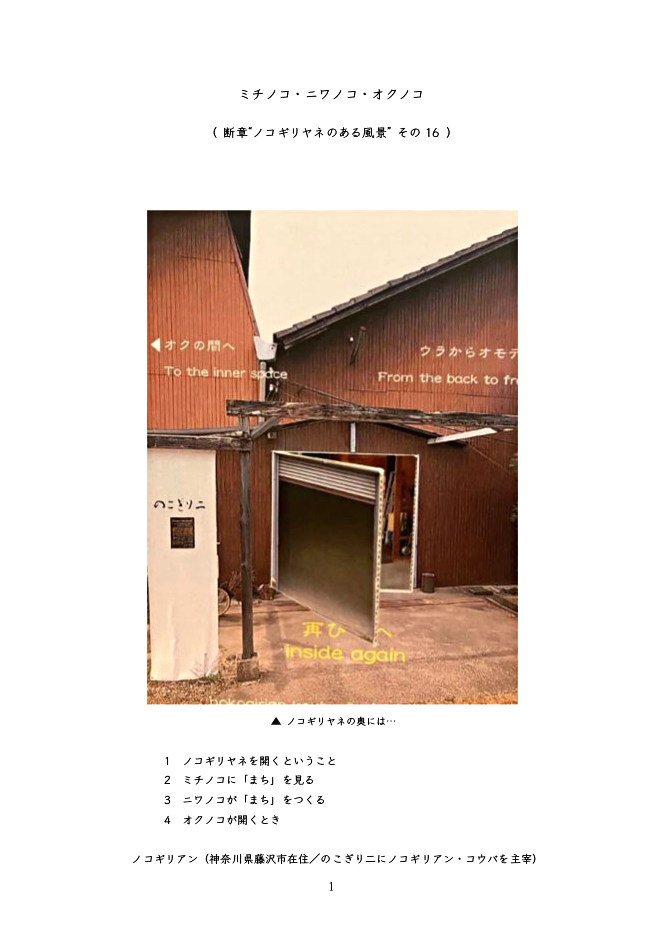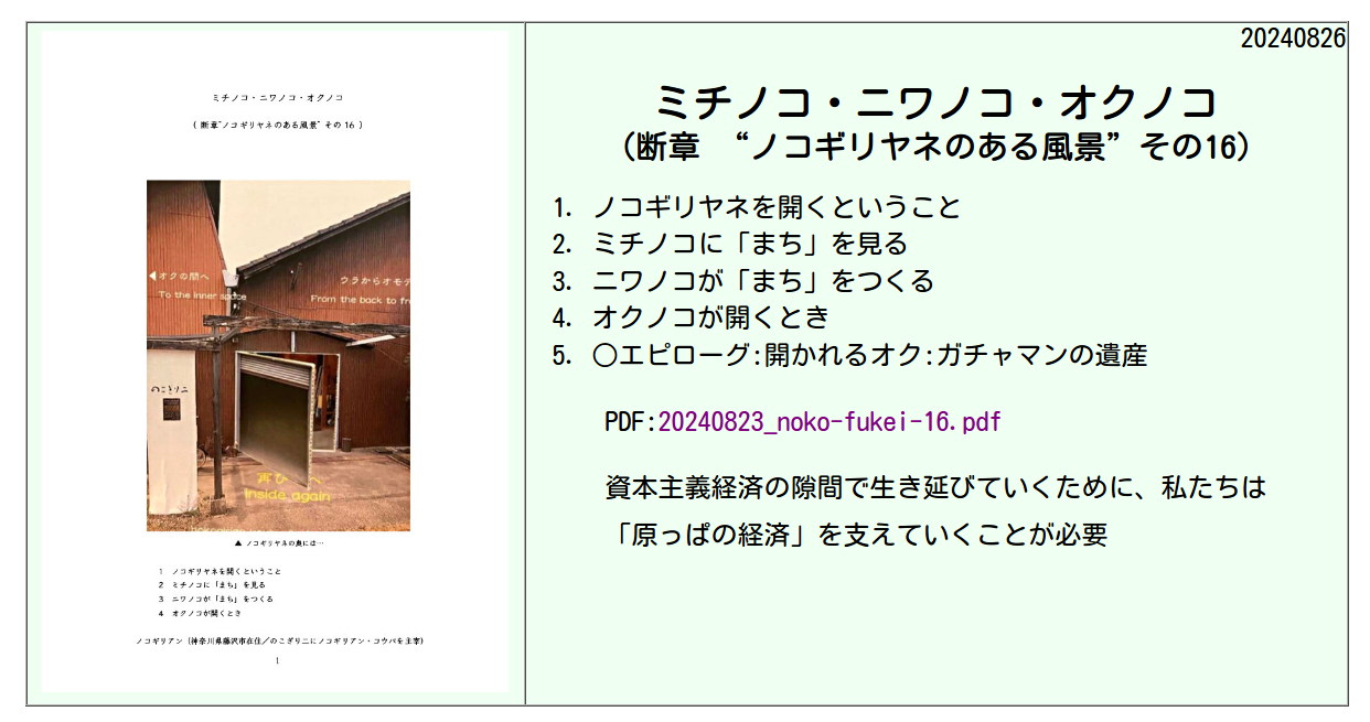 ノコギリアンから 「断章“ノコギリヤネのある風景”その16」 ミチノコ・ニワノコ・オクノコ が届きました。 20240823_noko-fukei-16.pdf 下記ページにて公開しました。 ・https://div.36way.net/ad138/nitsubonome/nokogirian/lib/20240823_noko-fukei-16.pdfhttps://div.36way.net/ad138/nitsubonome/nokogirian/nokoyane.htm ---- 1.ノコギリヤネを開くということ 2.ミチノコに「まち」を見る 3.ニワノコが「まち」をつくる 4.オクノコが開くとき 5.○エピローグ:開かれるオク:ガチャマンの遺産 ---- ・原っぱですよ。もっと平たく言えば、遊び場です。それは、お仕着せの遊具のある公園とは真逆のものです。面白いと思うことを自由にできる 場です。もちろん、いくつかの制約はありますけれど。創造の原点ですよ、遊びは。あるいは、「生きていく力」でしょうか。ノコギリヤネには、人が生存に必要としてきた家族や地域の共同体的記憶が残っているのかもしれません。 ・ひとりっきりの自分が立ち戻れる場がどこにあるでしょうか。ここの広場では、アーティストが絶対的なプライベート空間を開きます。日常の価値観に与しない自由な精神性。そこに本来の公共的空間が立ち上がり、私たちは「生きる力」を得るのです。それがオクノコです。 ・現代の遊園地はマーケット、企業の論理で運営されますが、原っぱは、そうではありません。資本主義経済の隙間で生き延びていくために、私たちは「原っぱの経済」を支えていくことが必要であり、ここにノコギリアン・コウバを置かせていただいている立場として、主体的に取り組むべきことと痛感せざるを得ません。 添付画像【1407_nokof-16.jpg : 90.2KB】添付画像【1407_2024-08-25_23-42-35.jpg : 154.1KB】添付画像【1407_2024-08-25_23-46-22.jpg : 97.6KB】