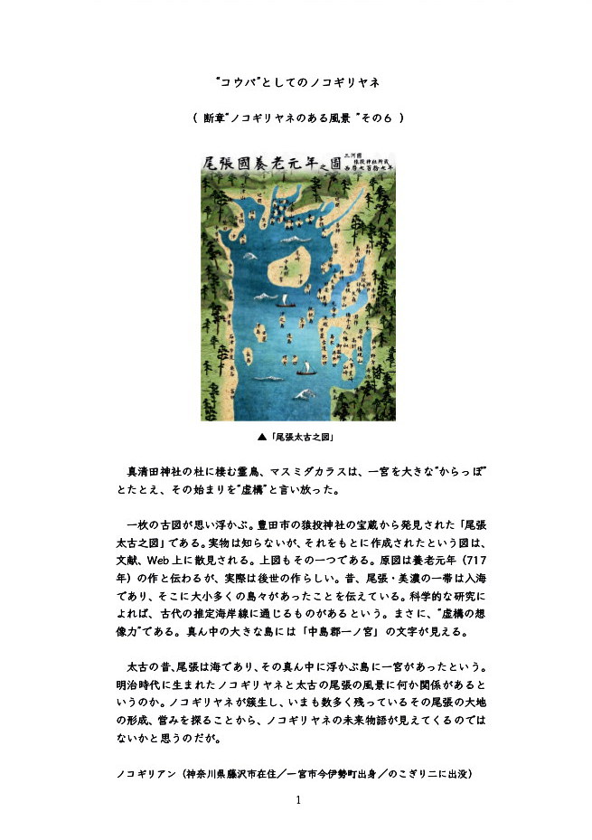 ノコギリアンから「断章“ノコギリヤネのある風景”その6」 ■“コウバ” としてのノコギリヤネ が届きました。 下記ページにて公開しました。 ・1209ノコ風景6 - 20201209_noko-fukei-6.pdf https://div.36way.net/ad138/nitsubonome/nokogirian/lib/20201209_noko-fukei-6.pdf ---- “コウバ” としてのノコギリヤネ (断章“ノコギリヤネのある風景”その6) 1.2,000 棟のノコギリヤネ 2.ノコギリヤネの生まれた大地 3.生活の営みを反映するノコギリヤネ 4.工場(コウバ)が開いて、公場(コウバ)に変わる 5.○エピローグ 6.●ノコギリヤネ分布図 ---- 「尾張太古之図」にはオドロキました。 ほとんど古事記誕生の年代の地図なんですね。 千数百年でこんなに地形が変わるモンなんですね。 今も尚、変わっている。ということに気付かされます(現在進行形)。 マスミダカラスの“マスカラ・スコープ”。 それは時空を超えた“眼”。 そこから初めて見えてくる“未来像”。 『あなた』も“星”のひとつなんですね。 ======= ・ノコギリアン文庫-Top https://div.36way.net/ad138/nitsubonome/nokogirian/ ・nokogirian-pdf-20201209.zip https://div.36way.net/ad138/nitsubonome/nokogirian/lib/nokogirian-pdf-20201209.zip ■nokogirian-pdf-20201209.zip:パッケージ内容 https://div.36way.net/ad138/nitsubonome/nokogirian/lib/readme_20201209.txt 添付画像【1089_nokof_6.jpg : 131.3KB】添付画像【1089_2020-12-10_00-43-20.jpg : 145.1KB】