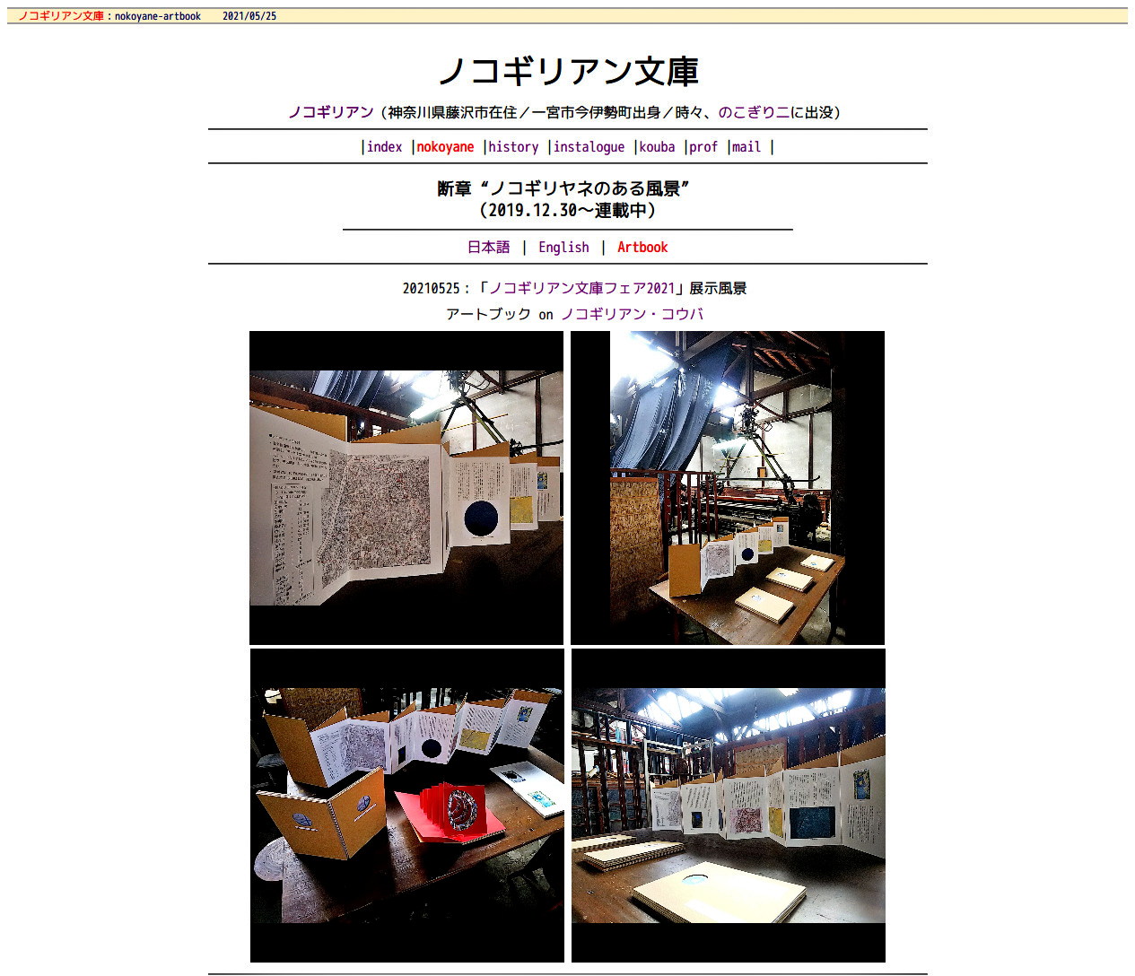 「ノコギリアン文庫フェア2021」展示風景 20210525:アートブック on ノコギリアン・コウバ https://div.36way.net/ad138/nitsubonome/nokogirian/nokoyane_artbook.htm ・ノコギリアン文庫フェア2021 https://div.36way.net/ad138/nitsubonome/nokogirian/_ex/Fair2021/ ・kouba_ノコギリアン文庫 https://div.36way.net/ad138/nitsubonome/nokogirian/kouba.htm 添付画像【1127_2021-05-25_nokoyane-artbook.jpg : 289.4KB】