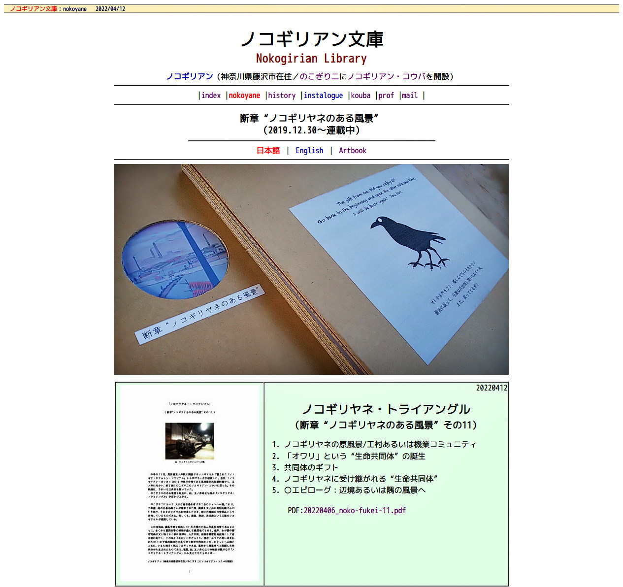 ノコギリアンから「断章“ノコギリヤネのある風景”その11」 ■「ノコギリヤネ・トライアングル」 が届きました。 下記ページにて公開しました。 ・0212ノコ風景11 - 20220406_noko-fukei-11.pdf https://div.36way.net/ad138/nitsubonome/nokogirian/lib/20220406_noko-fukei-11.pdf ---- 1.ノコギリヤネの原風景/工村あるいは機業コミュニティ 2.「オワリ」という“生命共同体”の誕生 3.共同体のギフト 4.ノコギリヤネに受け継がれる“生命共同体” 5.○エピローグ:辺境あるいは隅の風景へ ---- 生命共同体という新語? 生命共同体は「Life community」と訳すらしい? 運命共同体とは違った新鮮な響き 「家族」という言葉の背景を大きく広く視野した拡大語? 「オワリ」への大きな楔が入った「その11」 これまでのいくつかの「断層(章)」を参照していく手法もおもしろいテクニック。「断章のWeb(蜘蛛の巣)化」 =作品が脚注? =脚注が作品? それは「思考回路」そのもの。 “断章”だからこそできる? あるいは「夢の成り立ち」となる任意の結合遊び? 振って振られて渦の中。 それが「粒子」の対称性回転? シュールな作風が新境地か。 ノコギリアンもまた、遠藤薫氏の作品を遠く神奈川から眺めていた。 ・滞在制作・展示『羊と眠る』(あいち2022プレ展示) https://www.kaori-endo.com/post/works-exhibition-202203 ---- (その11・エピローグより) のこぎり二は、国際芸術祭「あいち 2022」(7/30-10/10)の会場のひとつとなっている。オワリの辺境の地、ノコギリヤネという辺境の空間で開催される「あいち 2022」。このギフトはセカイに開かれている。私たちは何を受け取るだろう。 そして、贈与は、返さなければいけない。断ち切ってはいけない。 ---- 添付画像【1185_nokof-11.jpg : 38.5KB】添付画像【1185_2022-04-12.jpg : 271.6KB】