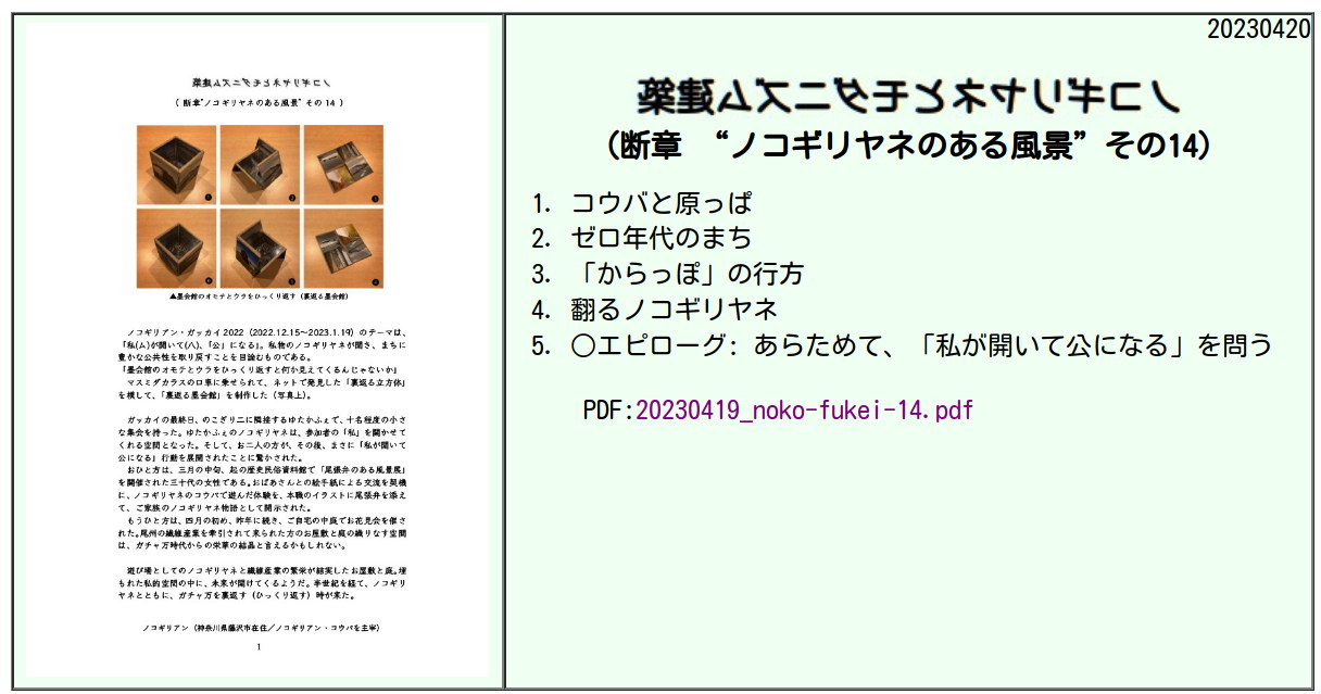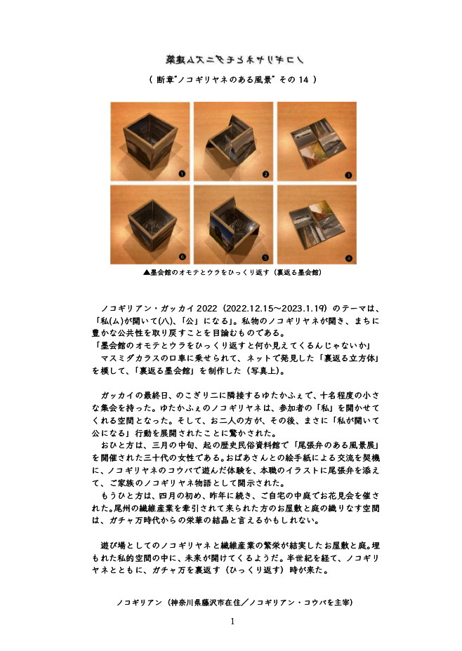 ノコギリアンから 「断章“ノコギリヤネのある風景”その14」 ■ノコギリヤネとモダニズム建築(題字左右反転) が届きました。 下記ページにて公開しました。 ・20230419_noko-fukei-14.pdf https://div.36way.net/ad138/nitsubonome/nokogirian/lib/20230419_noko-fukei-14.pdf ---- 1.コウバと原っぱ 2.ゼロ年代のまち 3.「からっぽ」の行方 4.翻るノコギリヤネ 5.○エピローグ: あらためて、「私が開いて公になる」を問う ---- 題字が左右反転されています。反転している文字列は「その13」に掲げた「ノコギリヤネとモダニズム建築」。この「反転」にノコギリアンの深い想いが込められているようです。 それを象徴するかのように、「その14」では「からっぽ」という言葉が11箇所も登場しています。 「からっぽ」 ・オワリの大きな“からっぽ”・一宮(その5) https://div.36way.net/ad138/nitsubonome/nokogirian/lib/20200923_noko-fukei-5.pdf →“からっぽ”から生まれた「ガチャ万」 ・ノコギリヤネとモダニズム建築(その13) https://div.36way.net/ad138/nitsubonome/nokogirian/lib/20221203_noko-fukei-13.pdf →ガチャ万とモダニズム建築 ・ノコギリヤネとモダニズム建築(その14)|題字左右反転 https://div.36way.net/ad138/nitsubonome/nokogirian/lib/20230419_noko-fukei-14.pdf →翻るノコギリヤネ と、「からっぽ」繋がりで読んでみるのもおもしろいかもしれない。 「断章」形式の醍醐味は、どこからどこへ読み進めても、その断面に繋がりが見いだせるところだろう。それはパズルのようでもある。組み合わせにルールはない。組み合わせによって表情を変える。組み合わせによって各自に見つけるものも異なってくるだろう。それが「からっぽ」なのかもしれない。 > ノコギリアン・ガッカイ 2022(2022.12.15-2023.1.19)のテーマは、「私(ム)が開いて(八)、「公」になる」。私物のノコギリヤネが開き、まちに豊かな公共性を取り戻すことを目論むものである。 主題は「ノコギリアン・ガッカイ 2022」に掲げた「私(ム)が開いて(八)、「公」になる」(カタリバ)を振り返っている。 https://36way.net/nag/2022/img/katariba-20230119.pdf https://36way.net/nag/2022/katariba-20230119.htm https://36way.net/nag/nag2022.htm > オモテとウラ(ウチとソト)をひっくり返す:ウチとソトは繋がっている > 行政の整備する公共空間は、「管理された空間」であり、民間の提供する公的空間は、収益をともなう遊園地化せざるを得ない。 > 「裏返る墨会館」は、ノコギリアン・コウバ(のこぎり二)に常設展示している。裏返す秘訣は、逆らわないことである。畳める方に畳んで開き、また、畳める方に畳んで開くことで、ウチとソトが裏返る。ぜひ、お試しあれ。ノコギリヤネもナカニワも、「私」という主体が伴ってこそ、開くものは自ずと開くと思われる。 さて、それぞれに「からっぽ」をイメージしてもらい、いつかまた、「からっぽ」を軸に「カタリバ」なる“場”を持ちたいものである。 『裏返す秘訣は、逆らわないことである。』 添付画像【1310_nokof-14.JPG : 142.2KB】添付画像【1310_2023-04-23.JPG : 152.2KB】