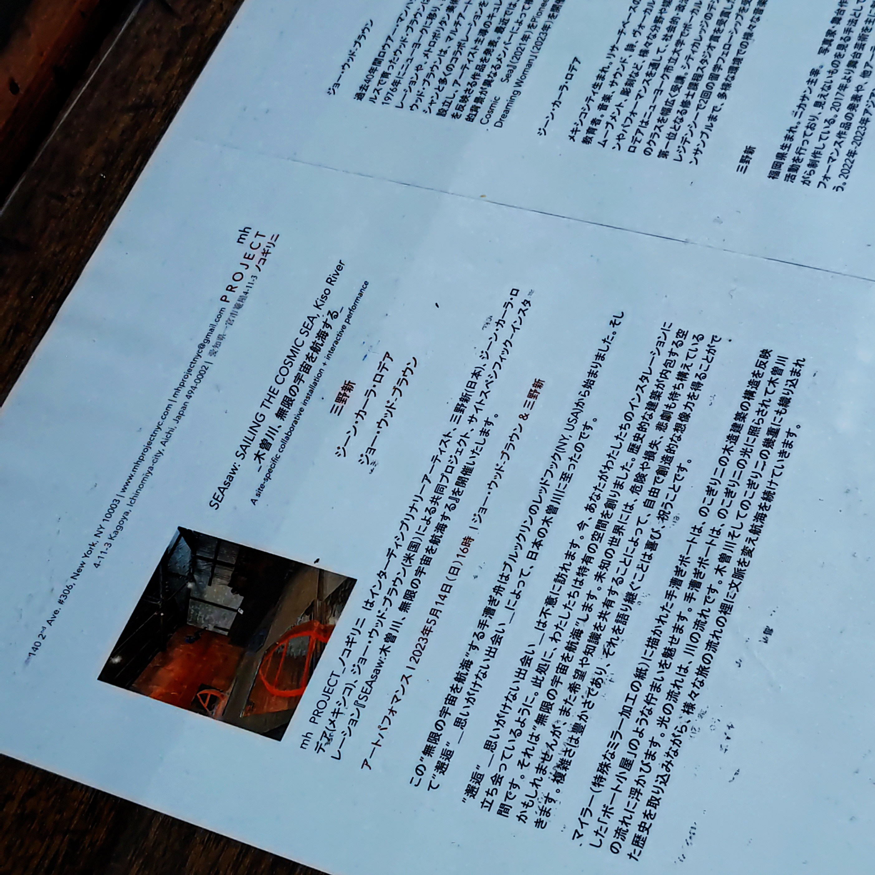 SEAsaw: SAILING THE COSMIC SEA, Kiso River _木曽川、宇宙を航海する_ アート・パフォーマンス 2023年5月14日(日)16時 ジョー・ウッド-ブラウン&三野新 https://mhprojectnyc.com/SEAsaw https://www.instagram.com/mhproject_nokogirini/ https://bit.ly/3KOxjm2https://www.aratamino.com/https://www.jeancarlarodea.com/https://www.jowoodbrown.com/ 添付画像【1312_DSC_0896.JPG : 1.3MB】添付画像【1312_DSC_0901.JPG : 1.9MB】添付画像【1312_DSC_0903.JPG : 2.1MB】