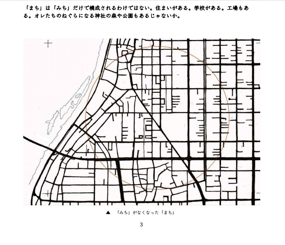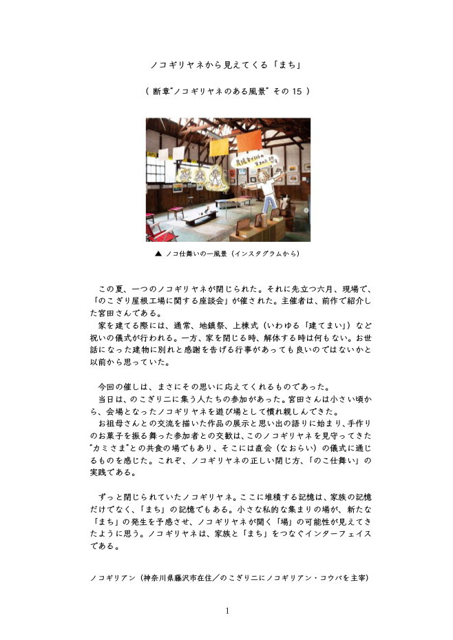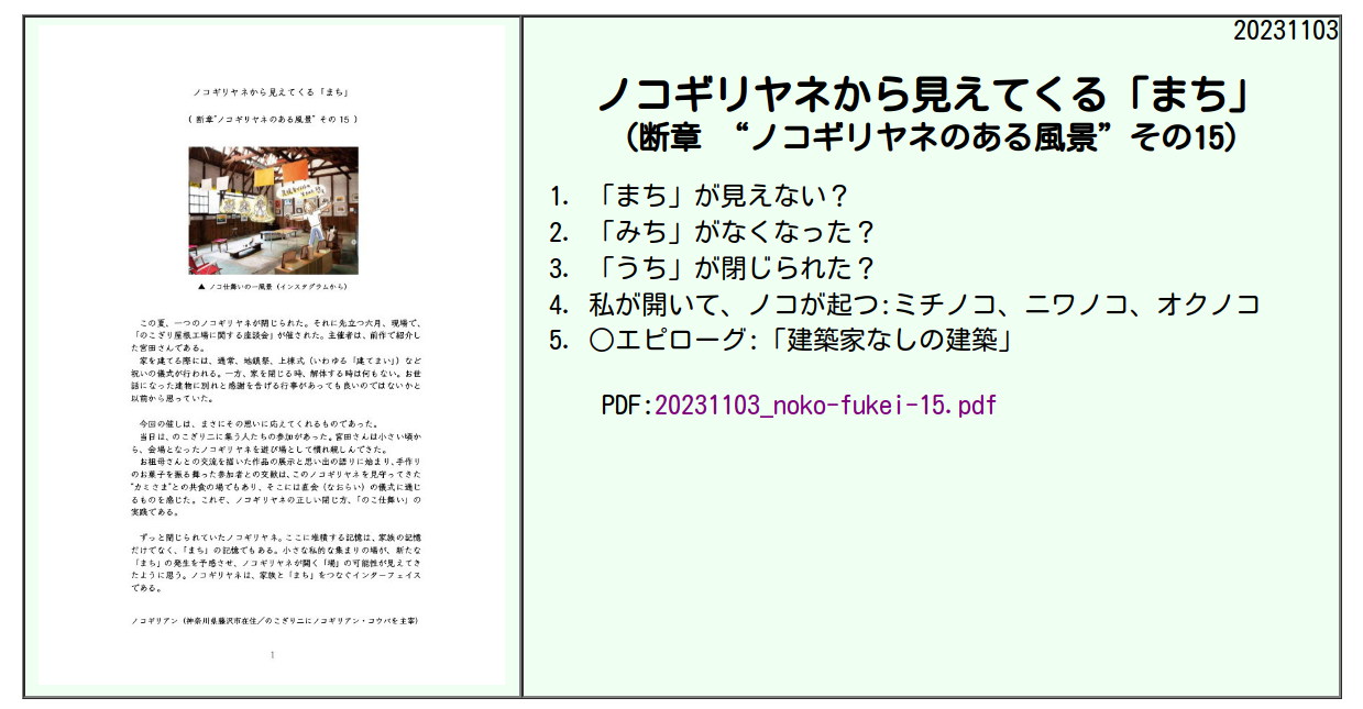 ノコギリアンから 「断章“ノコギリヤネのある風景”その15」 ノコギリヤネから見えてくる「まち」 が届きました。 20231103_noko-fukei-15.pdf 下記ページにて公開しました。 ・https://div.36way.net/ad138/nitsubonome/nokogirian/lib/20231103_noko-fukei-15.pdfhttps://div.36way.net/ad138/nitsubonome/nokogirian/nokoyane.htm ---- 1.「まち」が見えない? 2.「みち」がなくなった? 3.「うち」が閉じられた? 4.私が開いて、ノコが起つ:ミチノコ、ニワノコ、オクノコ 5.○エピローグ:「建築家なしの建築」 ---- ・「まち」は、多くの人が住み、働き、遊ぶところだった。多様な人との交流、複雑な人間関係もあれば、自由もあった。そこには、いいことも悪いこともあっただろう。そんなものが失われてしまい、のっぺりとした均質的なものに成り果てているのが現状ではないか。 ・「みち」が「まち」を作ってきた。人が歩いていなければ「みち」ではない。それは、通行のための道路に過ぎない。かつて、「みち」は開放的で自由な空間だった。そこで、色々なことを学ぶ。そして、子どもたちにとって、「みち」は遊びの場であった。まさに「未知」の空間だった。 ・「うち」は、私的空間と公共空間に区分され、原っぱのような所有や利用が曖昧な空間がなくなっていった。また、農村や寺社などの共同体の所有する土地が、「公(おおやけ)」が支配する公共空間として管理が厳重になっていく。そして、「みち」は自動車通行の公共性が優先され、歩行者は排除されていく。閉じられた「うち」は、「みち」との交流を失い、「まち」から分断されていった。 ・お前たちは翼がないから、不自由だな。本来、私というのは、もっと自由なはずだ。公というのは、私の集まりじゃないのか? そうだとすれば、公という空間には、もっと自由が必要じゃないのか。オマエたちは、「公(おおやけ)」に飼い慣らされているように見える。 添付画像【1369_nokof-15.jpg : 121.6KB】添付画像【1369_2023-11-05_10-53-55.JPG : 148.1KB】添付画像【1369_2023-11-05_10-52-38.JPG : 179.4KB】