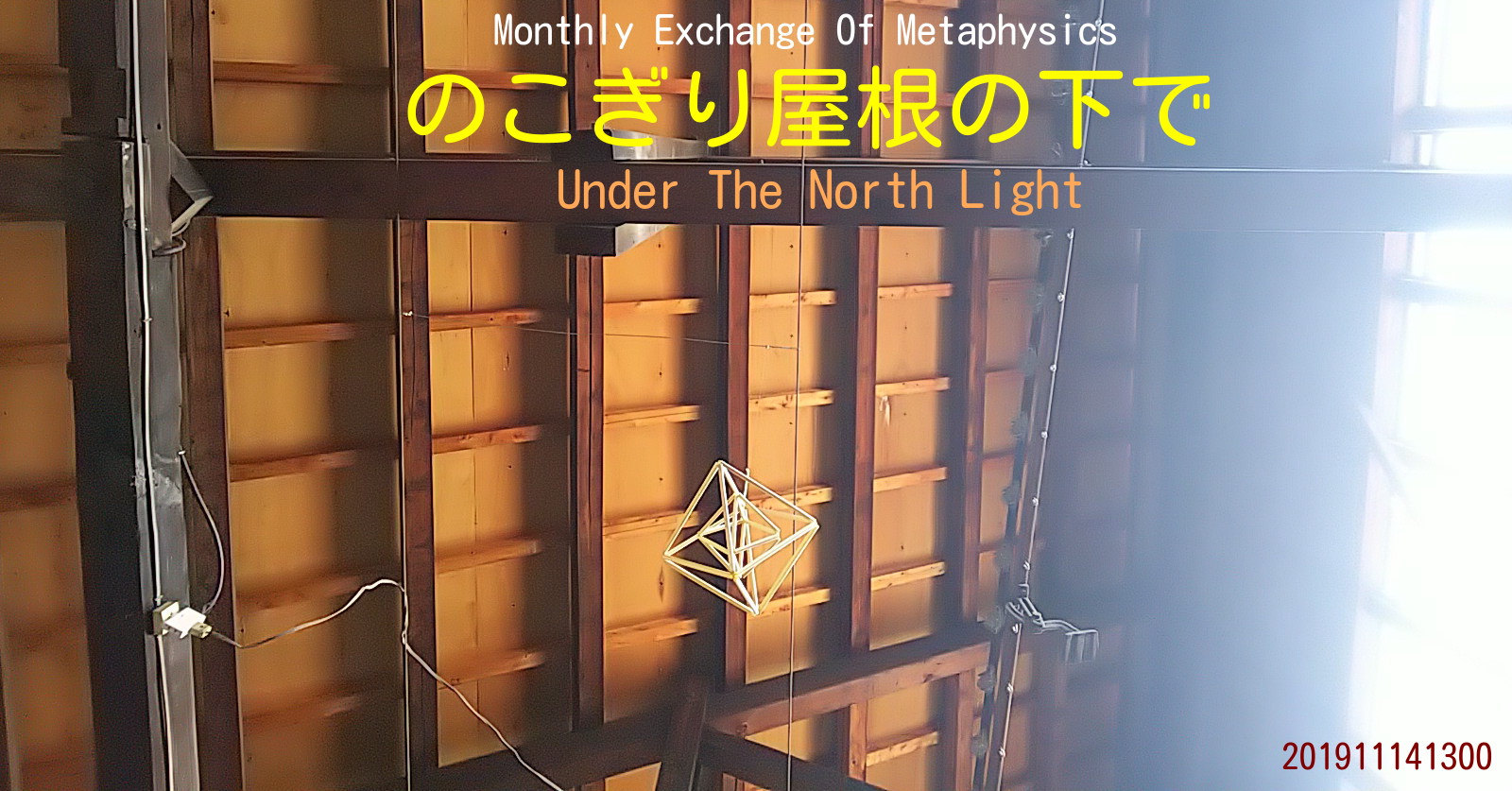 ■のこぎり屋根の下で Vol.26 次回開催日:2019年11月14日13時-17時 Monthly Exchange Of Metaphysics のこぎり屋根の下で Under The North Light ※持ち寄りテーマ歓迎 参加をご希望される方は、任意に題目としたい具体的な話題をご提示ください。 当日、その場で決めます。 特にテーマの提示が無い場合は、以下の定番メニューのいずれかを起点に意見交換を展開します。 ▼テーマ定番メニュー ・オープンソースを考える(Linux入門) ・プログラミングを考える(Scratch入門) ・矛盾を考える(磁石の特性にみる成り立ち) ・常識と非常識(日常と非日常) ・存在とは何か(在るから見えるのか、見えるから在るのか) ▼二坪の眼・エッセイ短編4部作 https://36way.net/nitsubonome.pdf ▼公園のベンチ(連載中) https://note.mu/nitsubonome/m/m576af74fce22 主宰:二坪の眼 問合:https://36way.net/fmail/36mail.htm 開催:毎月第二木曜日 13時-17時 参加:途中参加・途中退席可。飲み物・お茶菓子持参。参加費無料(寄付歓迎)。 会場地図:二坪の眼 https://www.facebook.com/nitsubonome/menu/ https://div.36way.net/ad138/nitsubonome/lib/20191114.pdf ----- ▼開催履歴 https://bit.ly/2Hluagb 添付画像【519_20191114.JPG : 329.9KB】添付画像【519_201911141300.jpg : 140.2KB】
