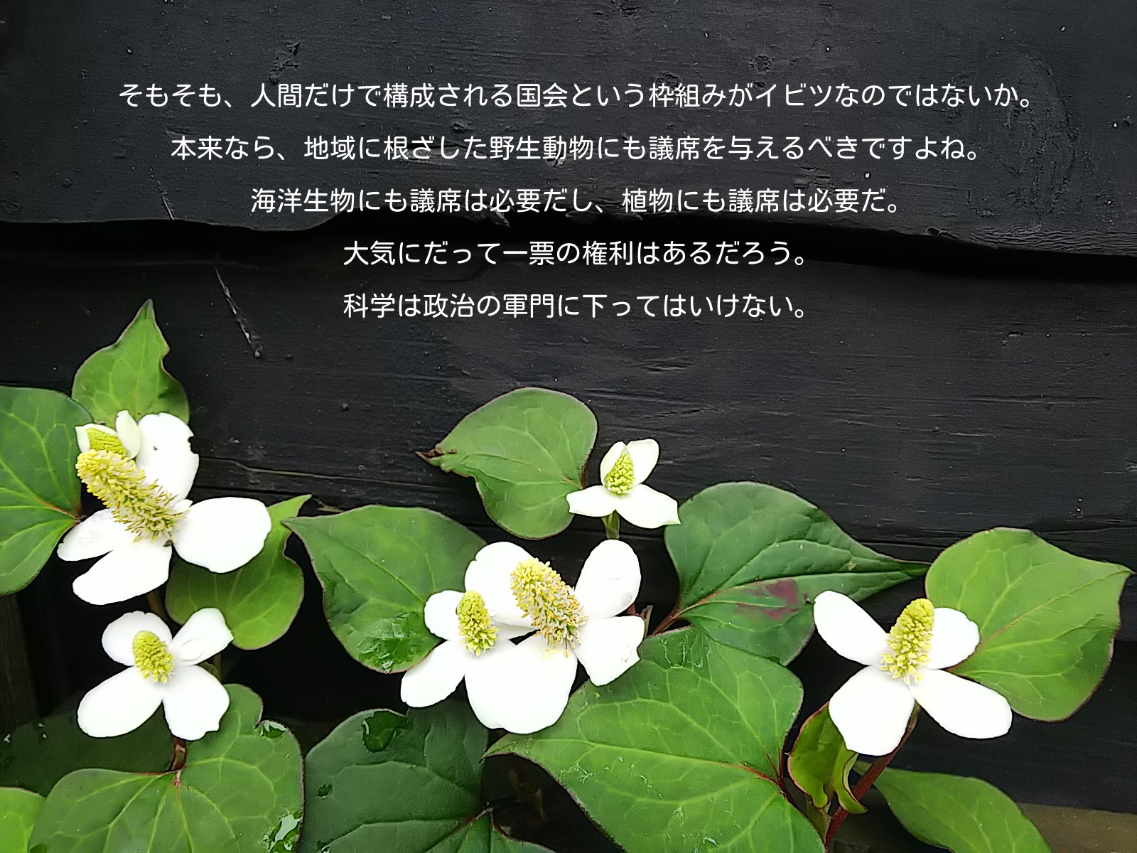 そもそも、人間だけで構成される国会という枠組みがイビツなのではないか。 本来なら、地域に根ざした野生動物にも議席を与えるべきですよね。 海洋生物にも議席は必要だし、植物にも議席は必要だ。 大気にだって一票の権利はあるだろう。 科学は政治の軍門に下ってはいけない。 -- 添付画像【674_DSC_0665-1.JPG : 481.1KB】