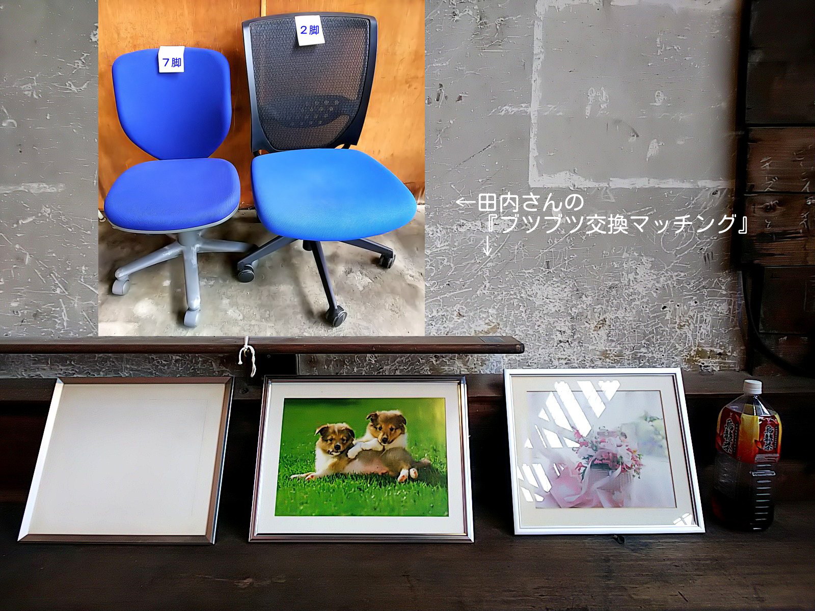 参加者:3名(20200813) ・野田 和弥さん(https://omoyaaino.jimdofree.com/https://www.facebook.com/kazuya.noda.16https://www.facebook.com/omoyaaino/) ・西岡 英明さん https://www.facebook.com/global.nishioka ・田内(惣sow)さん https://www.instagram.com/sou_sow/ ・私(二坪の眼:ホスト、https://div.36way.net/ad138/nitsubonome/) 以上。 今回は初参加の方が2名いらっしゃいました。 ・西岡さんは名古屋から ・田内(惣sow)さんは、新企画の『ブツブツ交換マッチング』にご関心いただきました。 まず、前回の点検を受けて野田さんから以下のような報告がありました。 [#705] (20200709) http://div.36way.net/bbs/brd.cgi?cmd=ntr;tree=441;id=ad138#705 > 現状は野菜の売り買いが中心になっている“朝市”ですが、取り扱う“モノ”をもっと拡大していくのも可能性を秘めているんじゃないか、と思いました。たとえば“物々交換”ができるような“場”とか。 ・“朝市”で野菜以外に古着を並べてみたら意外と購入された。 とのこと。今後の野田さん(愛の)の“朝市”展開が楽しみですね。 そして、時の話題としてこんな設問がテーブルに乗りました。 ・対価は自分で決める、ことができない。 「これは、いくらですか?」 「ご自身で決めてください。」 「それはできません」 これだけの例文では背景事情が特定できないので仲々判断しずらいところもあるでしょうが、ポイントは、売り手と買い手の立場において、売り手が買い手にその対価の決定を促した時、買い手は往々にしてそれを決めることができない、という心理が働く。という話題でした。 しかし、海外事情では意外と値段交渉の場面はあたりまえにある、という報告もありました。この場合の“値段交渉”のシーンと上記の「ご自身で決めてください。」との違いは、はじめに基準価格があるかないか、です。 価格設定のないものに買い手が価格を決定する。という状況です。 そこにはどんな心理が働いて“価格(対価)決定”に至れないのか。 興味深い思考実験でした。 ・田内(惣sow)さんは、新企画の『ブツブツ交換マッチング』に寄せて、事務用椅子2タイプとピクチャー額3点をご持参(写真参照)くださいました。 あいにく、私も含めて他の参加者は『ブツブツ交換マッチング』に寄せるモノをお持ちでなかったので、今回はマッチング不成立、という結果となりました。 ただし、この『ブツブツ交換マッチング』のマッチング率って、相当確率的に“ありえない”んじゃないか、という意見もありました。 同時に、その“偶然性”がおもしろいんじゃないか、という意見もありました。 思考実験的に今回からはじめた『ブツブツ交換マッチング』ですが、具体例をご提示いただけた田内さんには感謝しております。 今回、田内さんがご提示くださった品々については、今後も情報として保管していきたいと思っています。その上で、いろいろなケースを体験していくなかで、『ブツブツ交換マッチング』の独特(魅力的)な運用方法が見出せていけたら、と期待しています。 ・西岡さんが田内さんの“惣sow”に関心を持たれる。 西岡さんは建築に造詣が深く、田内さんの“惣sow”に興味を持たれました。そこで、“惣sow”は会場(二坪)からも近い位置にあることから、今回は二部構成として後半は急遽、会場を“惣sow”に移動して見学させてもらいました。 田内さん曰く、今の悩みは車の出し入れに障壁となる“塀”を取り壊したい、とのこと。(課題の塀の写真はありません。m(__)m) ・この塀は頑強にできていて、容易に取り壊すことはできないだろう。 ・むしろ、塀を活用する方法を考えてみてはどうか? とかの意見も出ましたね。 ---- なお、次回より“のこぎり屋根の下で”の開催案内及びレポートは、以下のサイトにて展開していくことにします。 ※告知掲載サイト ・https://div.36way.net/bbs/brd.cgi?id=ad138http://div.36way.net/bbs/brd.cgi?cmd=ntr;tree=441;id=ad138) ・https://note.com/nitsubonomehttps://note.com/nitsubonome/m/m75df4a23ec77) ・https://www.instagram.com/nitsubonome/https://twitter.com/36way これまで、Facebookのイベントページを活用してきましたが、今後はFacebookのイベントページでの告知はなくなりますのでご注意ください。 各自の利便性においてご活用いただければ幸いです。 添付画像【861_20200813-1.jpg : 0.8MB】添付画像【861_DSC_0525-1.JPG : 0.5MB】添付画像【861_DSC_0531-1.jpg : 308.5KB】