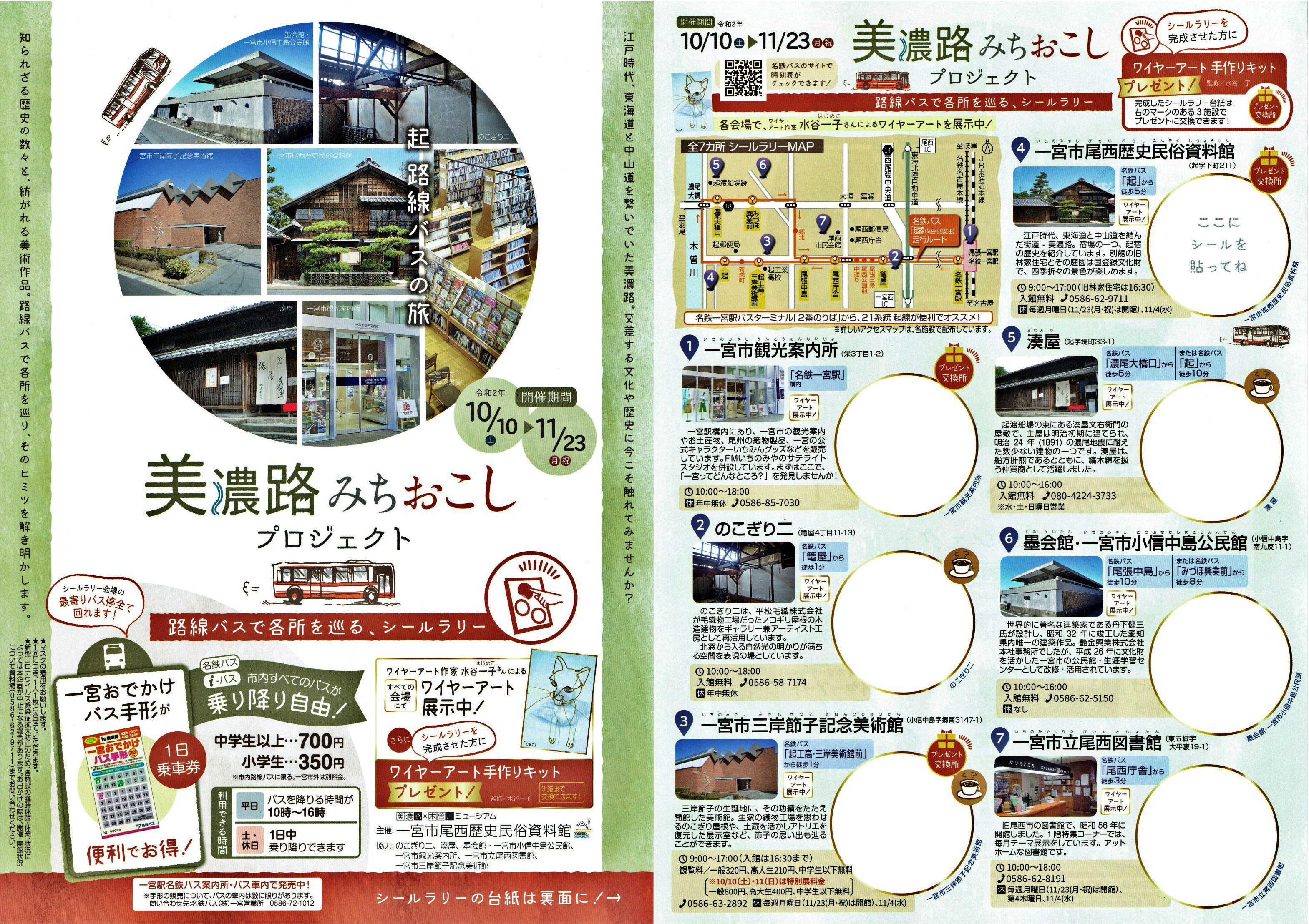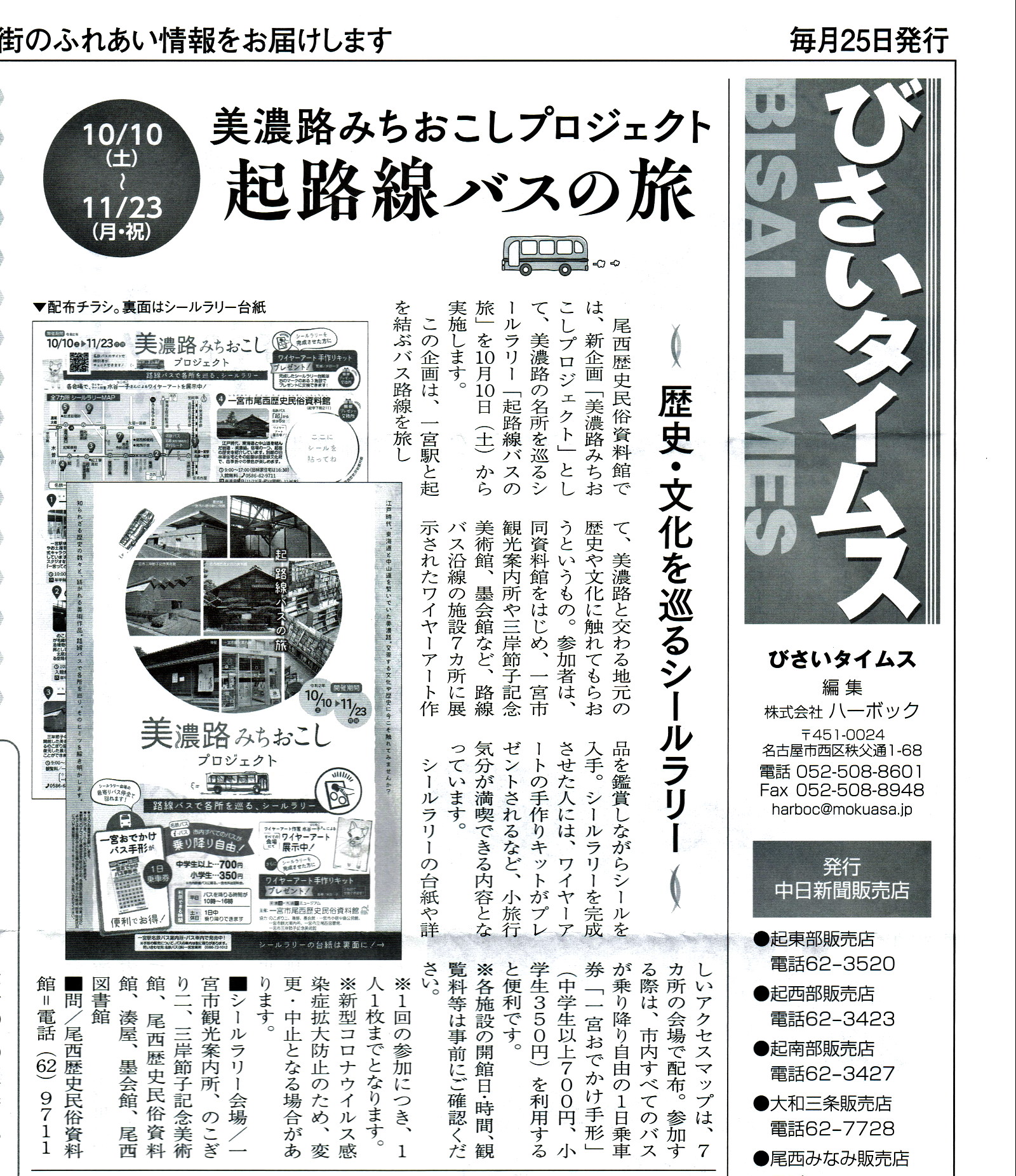 美濃路みちおこしプロジェクト『起路線バスの旅』 - 歴史・文化を巡るリールラリー - ・一宮市尾西歴史民俗資料館|一宮市 https://www.city.ichinomiya.aichi.jp/rekimin/ ・美濃路みちおこしプロジェクト|一宮市 https://www.city.ichinomiya.aichi.jp/rekimin/1008901/1008903/1033114.html ▼シールラリー会場 ・一宮市観光案内所 ・のこぎりニ ・三岸節子記念美術館 ・尾西歴史民俗資料館 ・湊屋 ・墨会館 ・尾西図書館 -- びさいタイムス9月号(2020年9月25日発行) 発行:中日新聞販売店 編集:株式会社ハーボック 添付画像【1018_20200924-17.jpg : 0.9MB】添付画像【1018_20200829-a.jpg : 2.4MB】